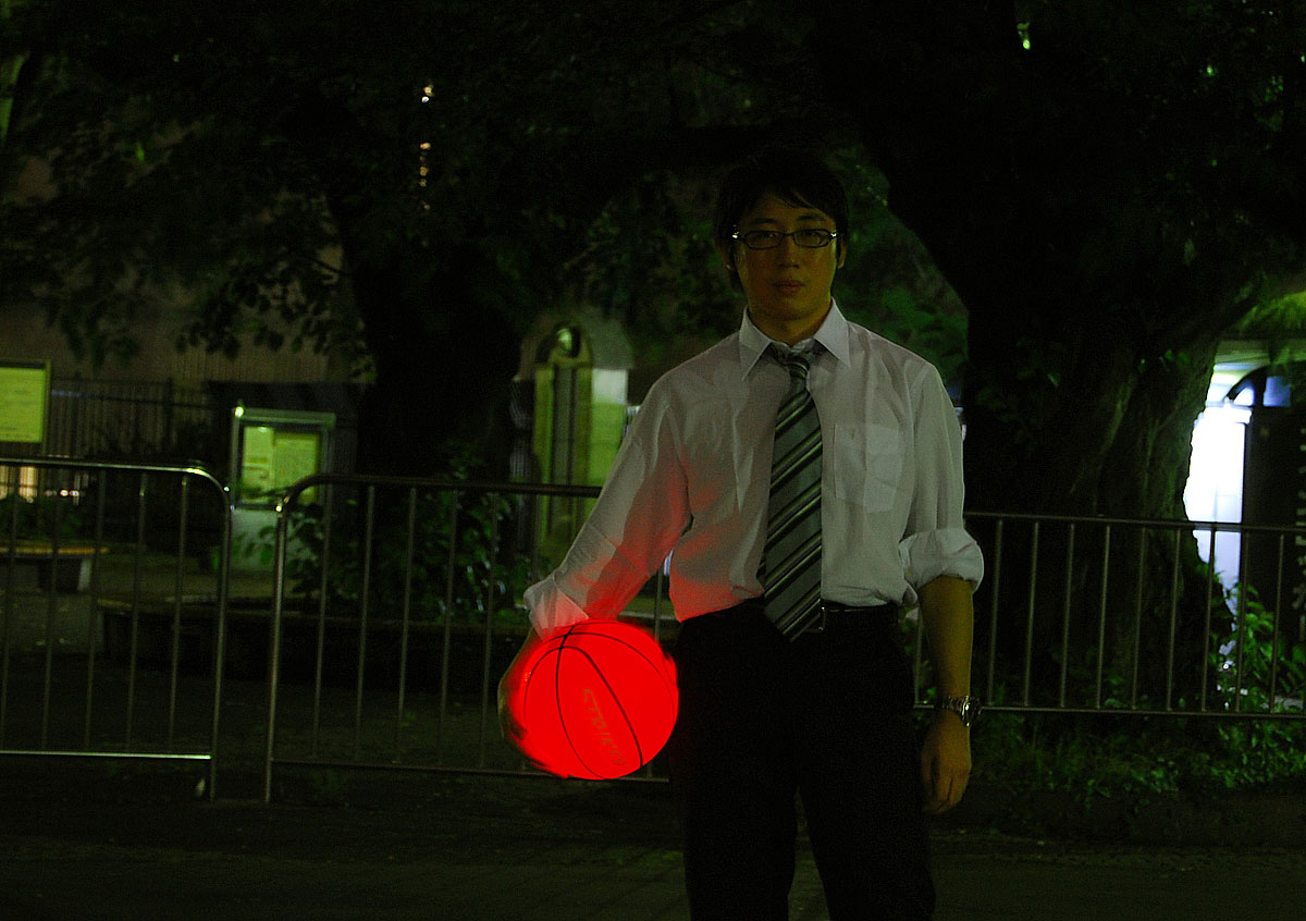 振動センサーの付いたLEDが内蔵されているバスケットボールです。ドリブルすると写真のように光ります。